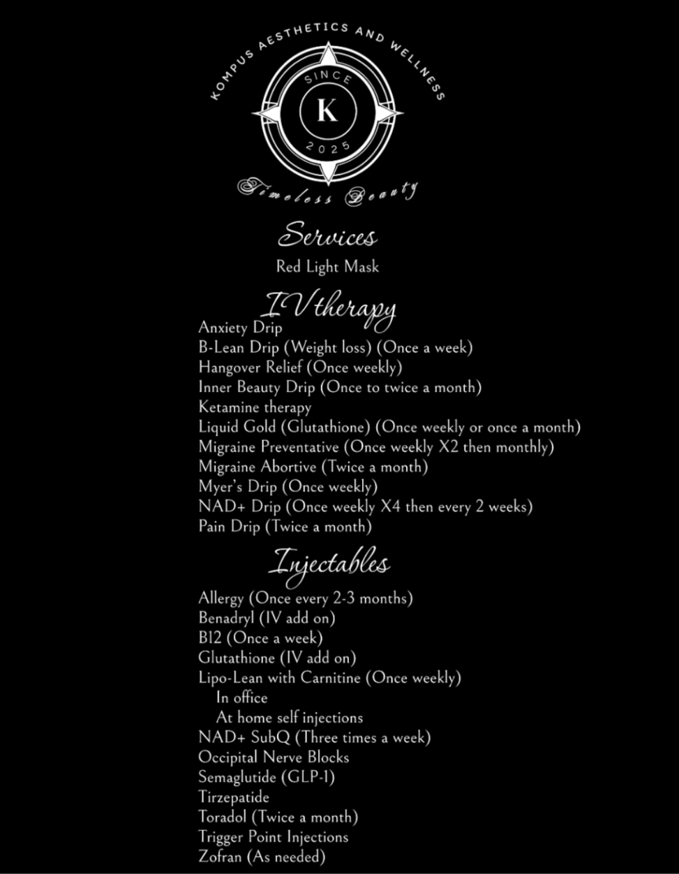 At Kompus Aesthetics and Wellness, we specialize in cutting-edge, medically supervised treatments designed to help you look, feel, and live your best. Our comprehensive suite of services is tailored to support your weight loss journey, enhance your aesthetic goals, and promote overall well-being. Whether you're looking for transformative results with advanced weight loss options like GLP-1 agonists and Tirzepatide, revitalizing your body with IV hydration therapy, or smoothing fine lines with Botox, our experienced team is here to guide you with care and expertise.